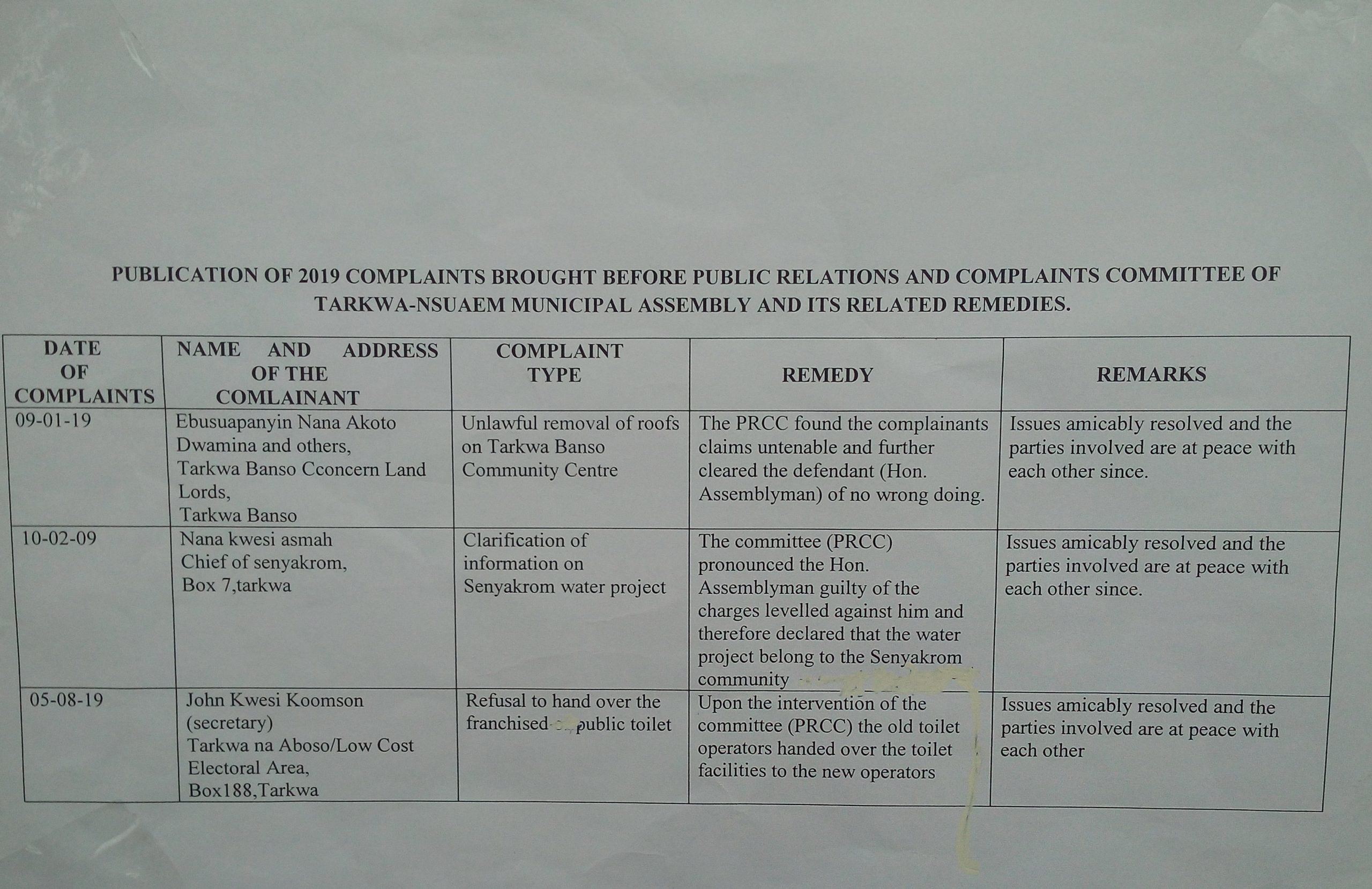 The Public, Assembly Members and all other Stakeholders of the Tarkwa Nsuaem Municipal Assembly are hereby notified of the 2019 complaints brought before the Public Relations and Complaints Commitee and its related matters. Please find below copy of Publication